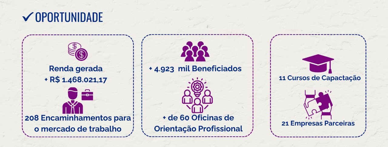 Desenvolvemos também o Projeto Compartilha Oportunidade, uma iniciativa dedicada a abrir portas e criar oportunidades para aqueles que enfrentam desafios socioeconômicos. Nossa missão é oferecer suporte e recursos para capacitar indivíduos em situação de vulnerabilidade, promovendo a igualdade de acesso à educação, emprego e desenvolvimento pessoal. Através de parcerias com organizações locais, programas de capacitação profissional e orientação vocacional, buscamos capacitar e inspirar os participantes Abaixo resultados desse Projeto: