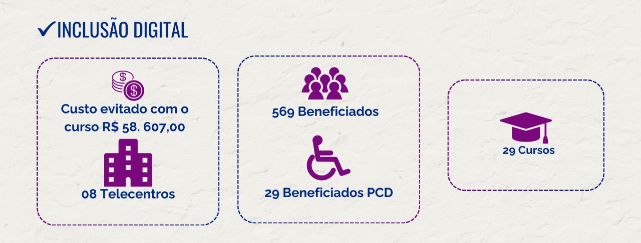 Também colocamos em prática o Projeto Inclusão Digital, que tem como objetivo capacitar pessoas de todas as idades e origens a se tornarem proficientes no uso da tecnologia, permitindo-lhes participar plenamente da sociedade digital em constante evolução. Através de aulas de informática, acesso à internet, treinamento em habilidades digitais e suporte técnico, buscamos reduzir a exclusão digital e capacitar os indivíduos a aproveitarem os inúmeros benefícios oferecidos pela era digital. A seguir resultados do Projeto: